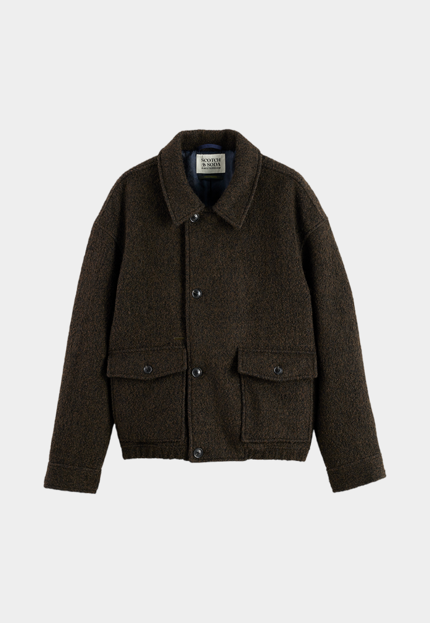 ג'קט לגברים מבית המותג סקוצ' אנד סודה. בגזרה קלאסית משוחררת, עם צווארון קלאסי, כפתורי סגירה לכל האורך ורוכסן, עם שני כיסים קדמיים.
